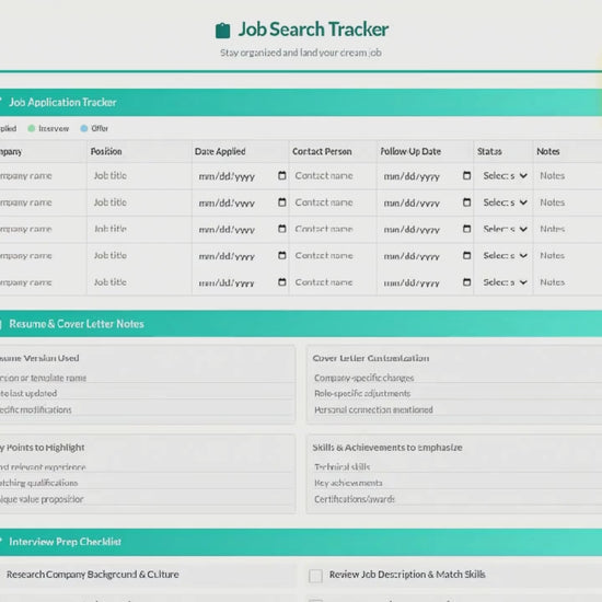 Transform your job search from chaotic to strategic with this comprehensive Job Search Tracker template. Designed for serious job seekers who want to stay organized, track progress, and maximize their chances of success.